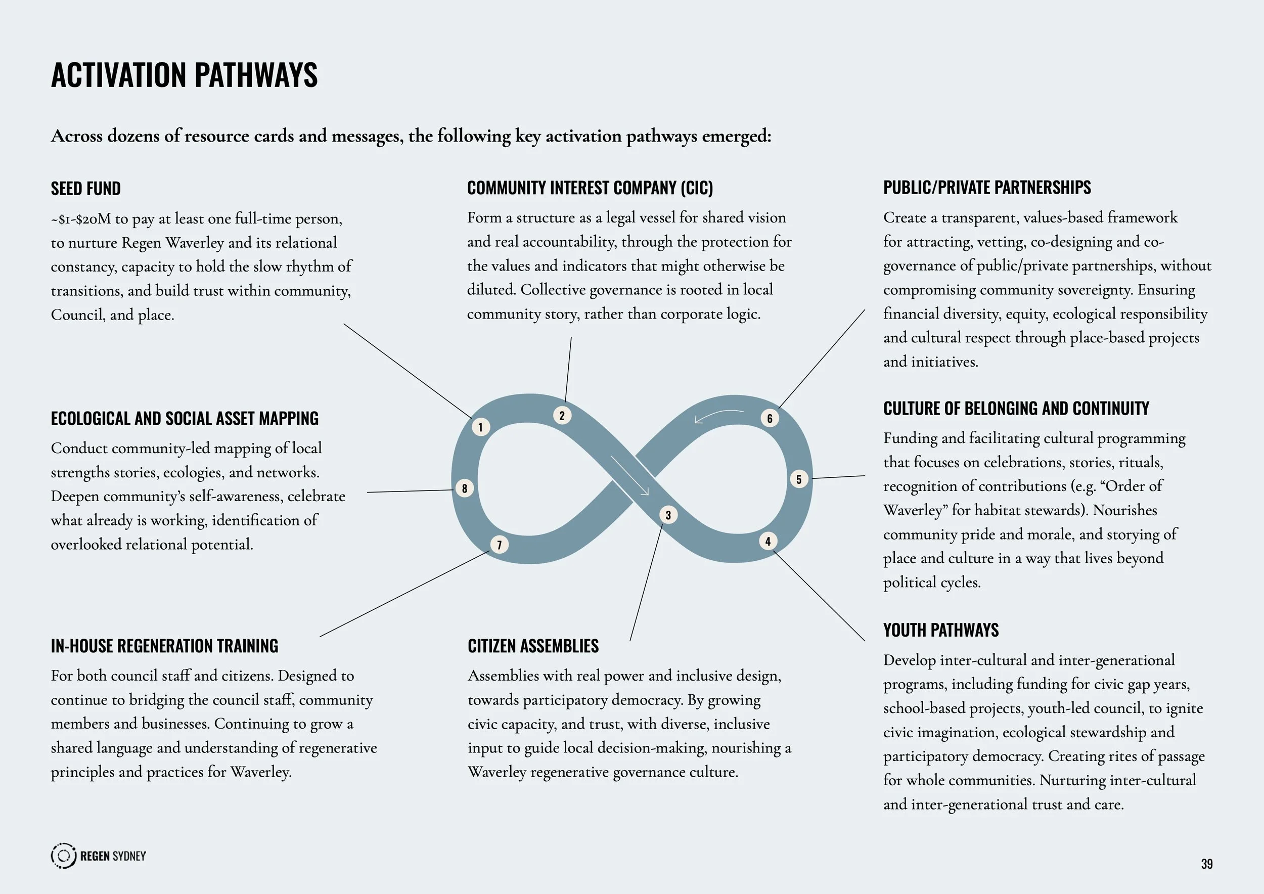 Through this program, Regen Sydney helped to develop and model new civic infrastructure in the form of a cross-sector community of practice: bridging across community, Council and private-sector stakeholders. Co-design workshops and informal gatherings grew the collective regenerative literacy, and also facilitated the collective to craft avenues for meaningful action.